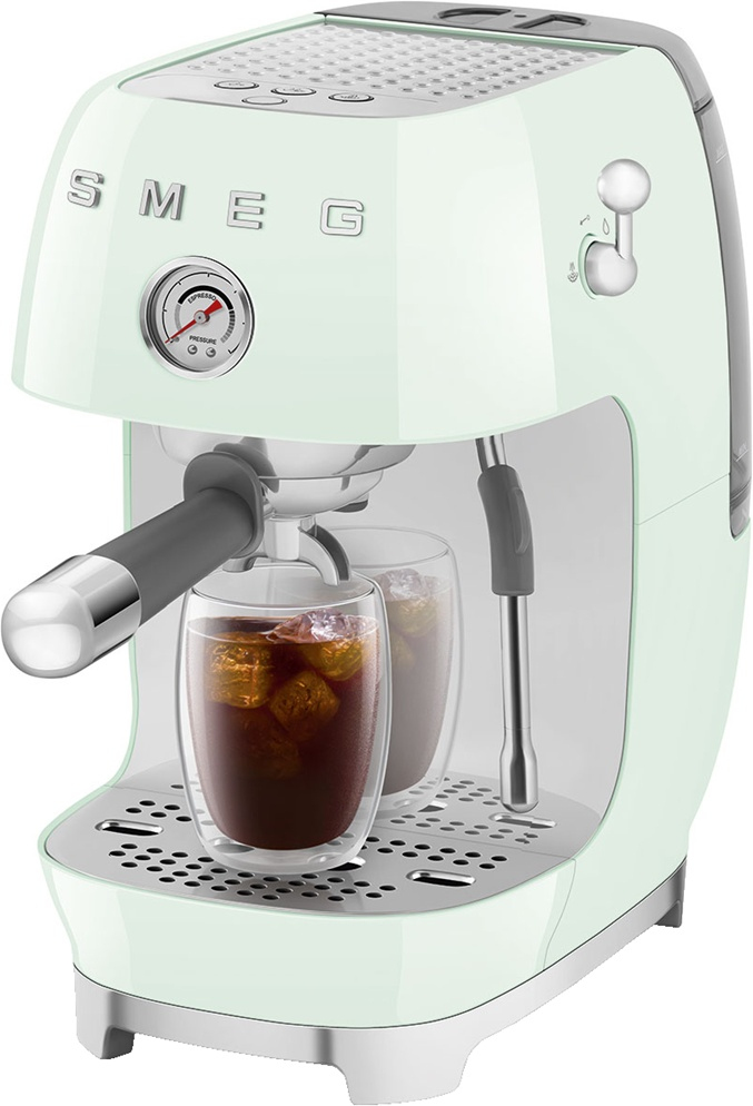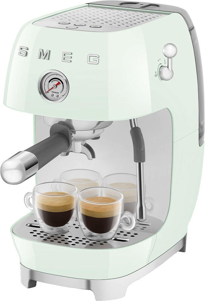 Рожковая полуавтоматическая кофемашина SMEG ECFO3PGEU заливного типа предназначена для приготовления эспрессо, капучино и других кофейных напитков на основе молотого кофе. Корпус изготовлен из литого алюминия пастельно-зелёного цвета, основание – из пластика, холдер, рамка, капучинатор и поддон для чашек – из нержавеющей стали.