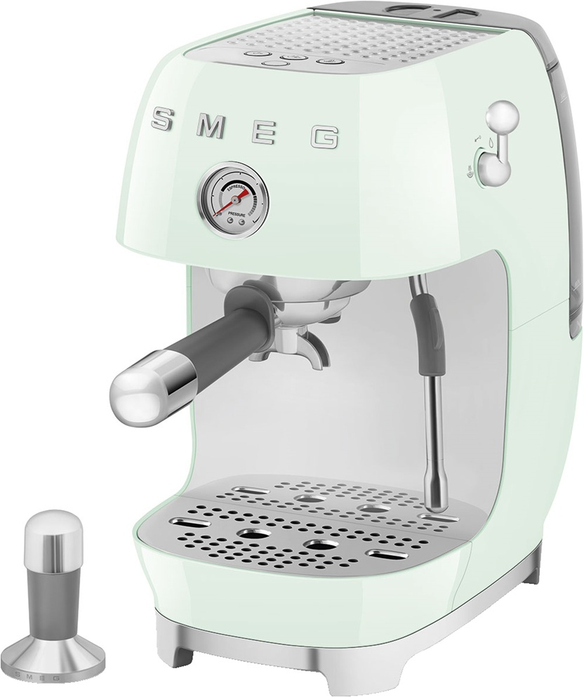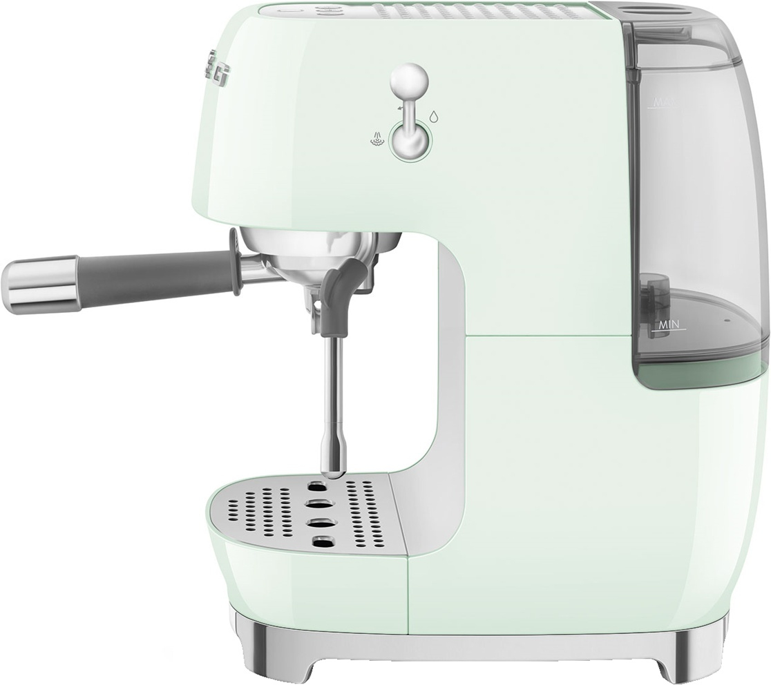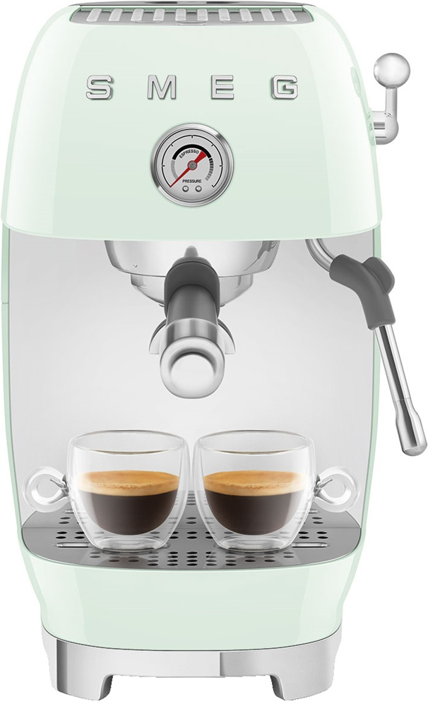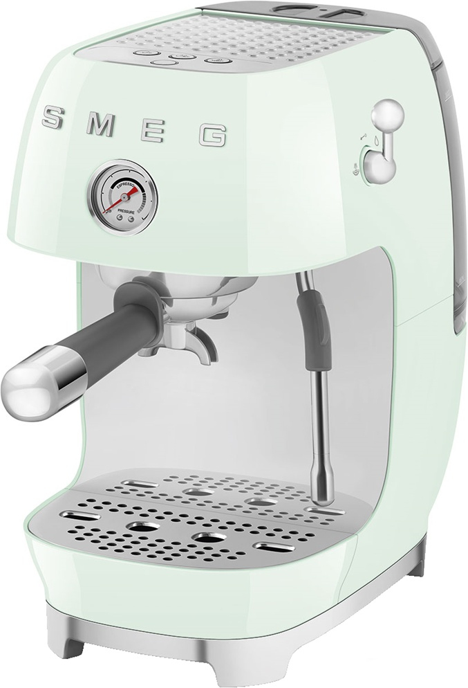 Рожковая полуавтоматическая кофемашина SMEG ECFO3PGEU заливного типа предназначена для приготовления эспрессо, капучино и других кофейных напитков на основе молотого кофе. Корпус изготовлен из литого алюминия пастельно-зелёного цвета, основание – из пластика, холдер, рамка, капучинатор и поддон для чашек – из нержавеющей стали.